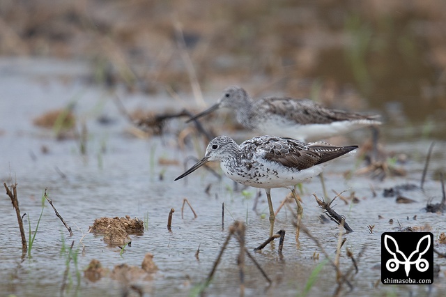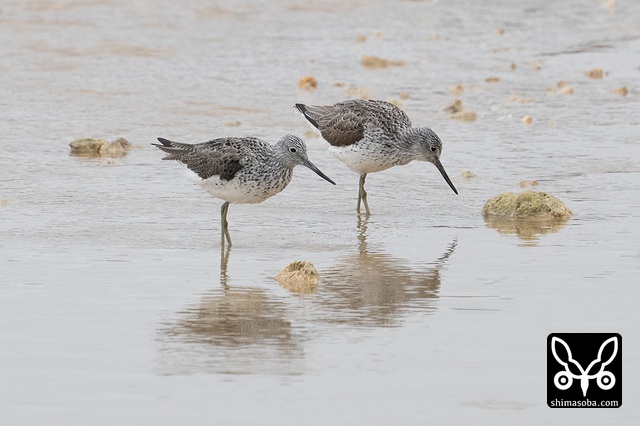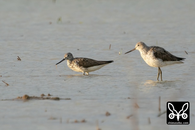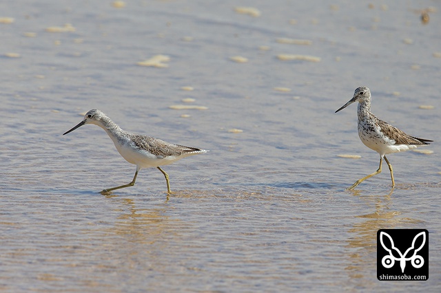 アオアシシギは2羽で小さな魚を追いかけまわしていました。右はまだ夏羽、左はほぼ冬羽になっていました。