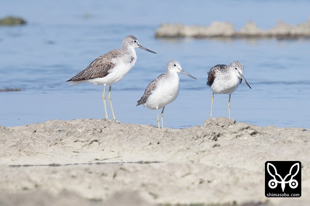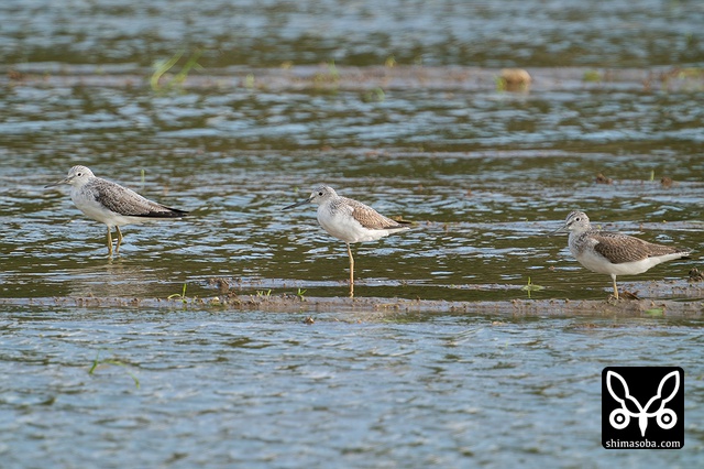 アオアシシギ。左が成鳥で他は幼鳥。