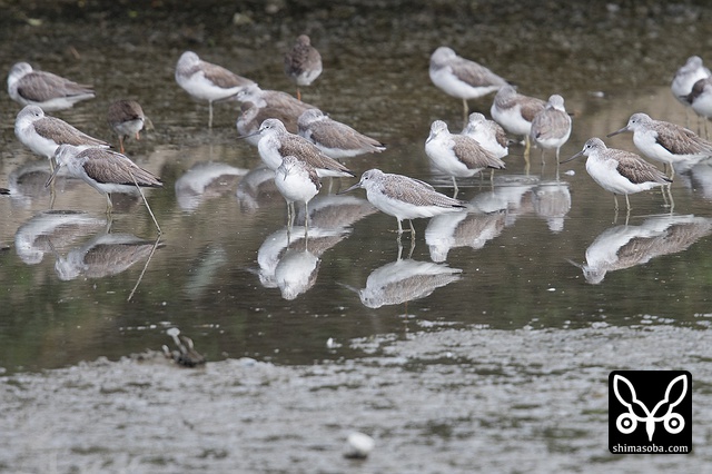 日々変動はありますが、三角池にはアオアシシギが数十羽滞在しています。写真は群れの一部。