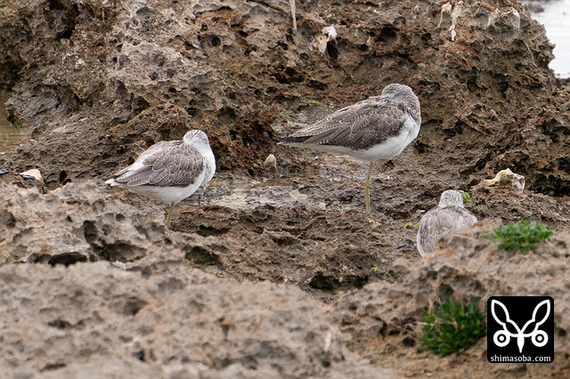 アオアシシギは岩場で休憩。