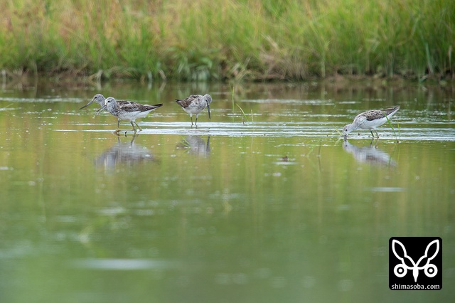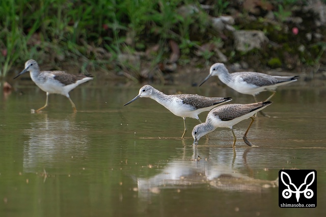 アオアシシギ4羽。全て成鳥で夏羽から冬羽に変わりつつあります。