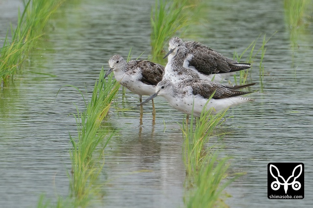 アオアシシギは数羽の群れで田んぼにいます。
