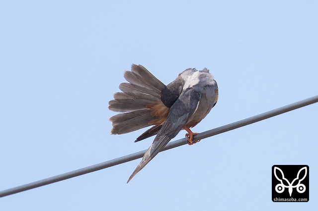 アカアシチョウゲンボウの成鳥オスの背面は美しい青灰色。