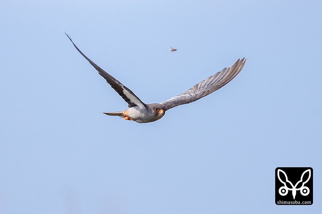 アカアシチョウゲンボウの目線の先の黒い小さな物体が獲物のハチ。