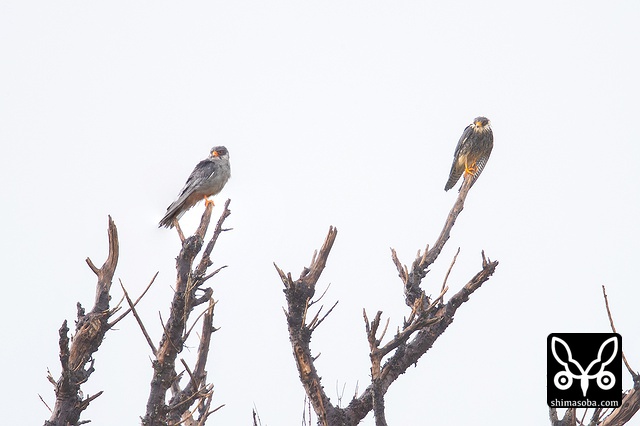 夕方には激しい雨の中、アカアシチョウゲンボウのメス(右)も同じ牧草地に現れた。
