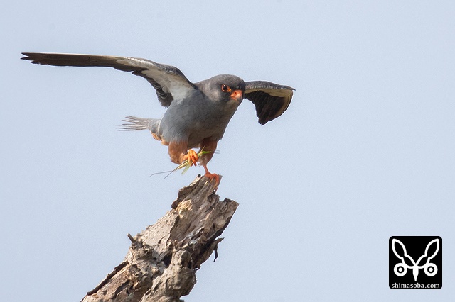 大きなバッタを握りしめお気に入りの止まり木に帰ってきたアカアシチョウゲンボウ。
