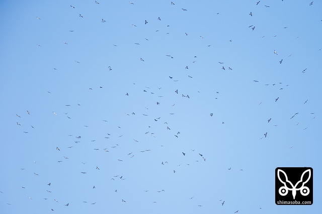 本日最大の群れ。200羽以上のアカハラダカが渦のように舞いながら大きなタカ柱をつくる光景は圧巻。