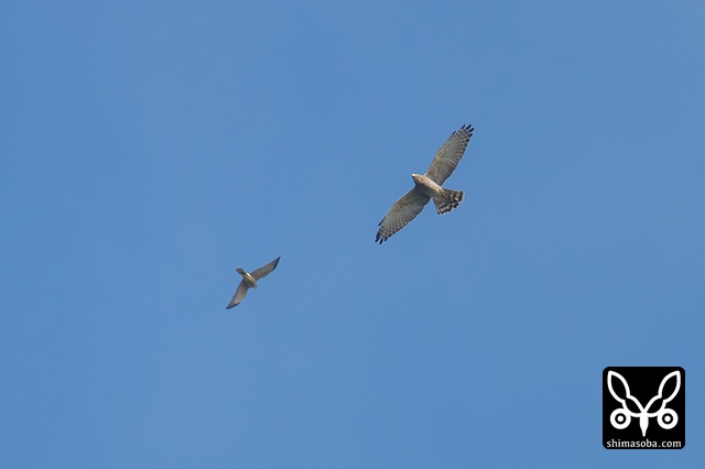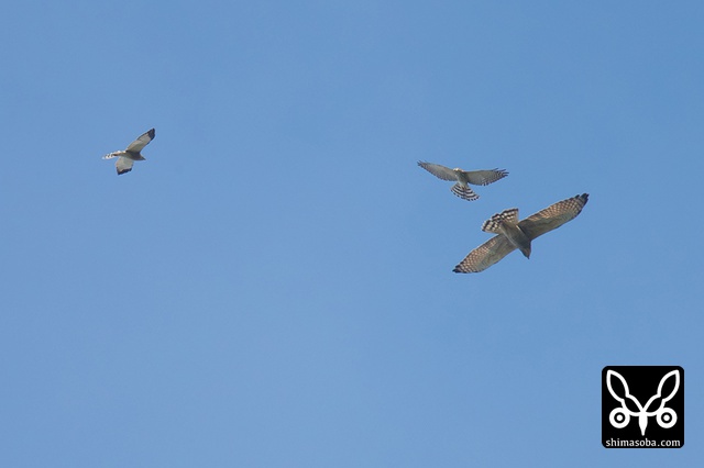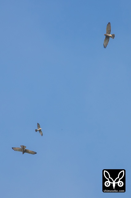 写真を撮っている時は、サシバとアカハラダカのツミが撮れたと思ったのですが、写真をよく見るとサシバの成鳥とアカハラダカの成鳥と幼鳥ですね。^^;