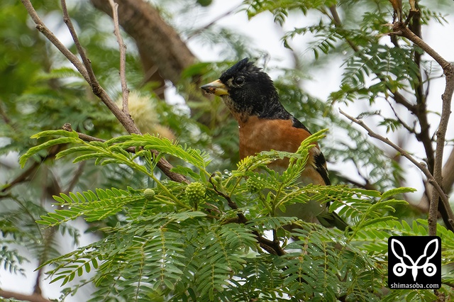 アコウの実をついばむアトリのオス。