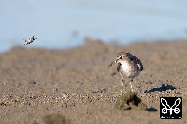じっと座っていると目の前までイソシギがやってきた。左上には宙を舞うカニ。^^;