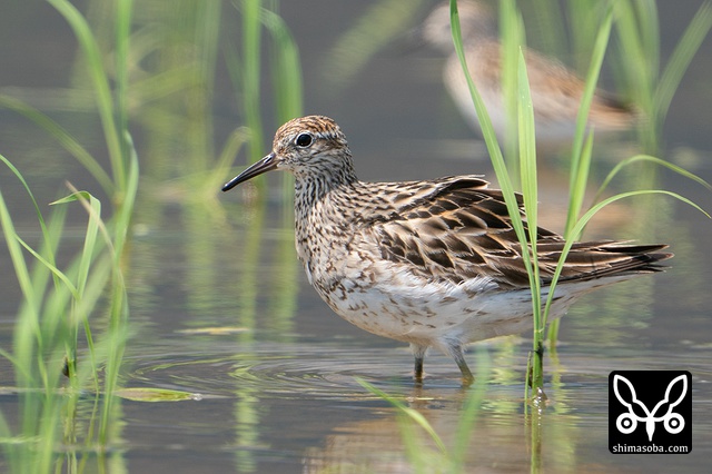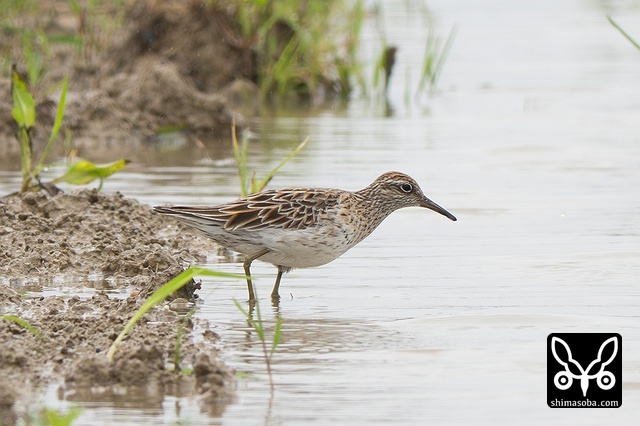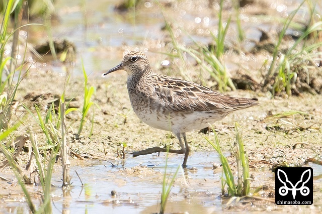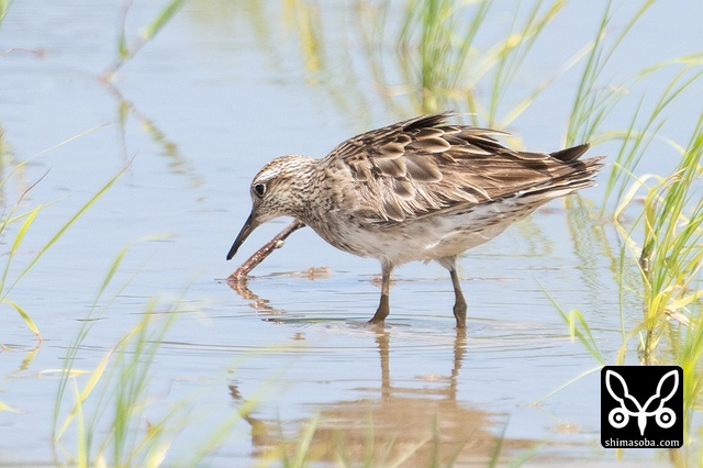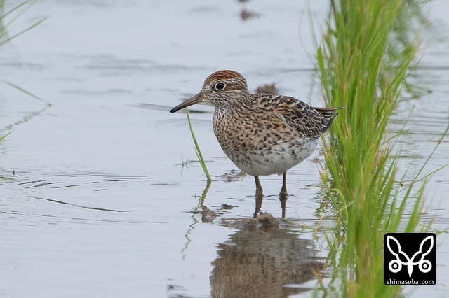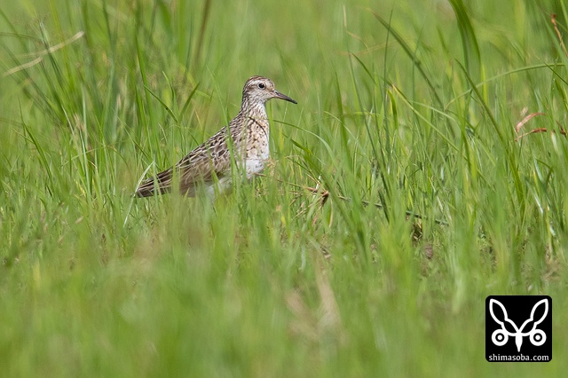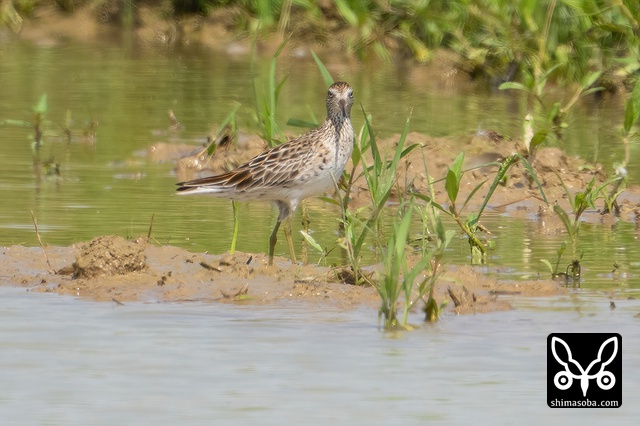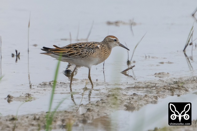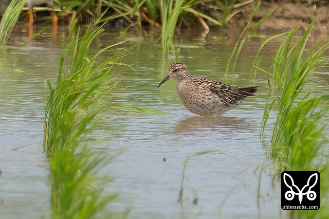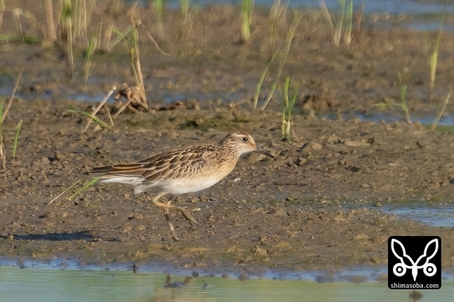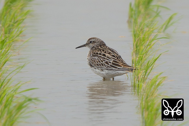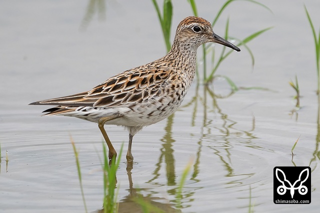 ウズラシギ。数は少なく、島内の田んぼで見かけるときは大抵1羽です。
