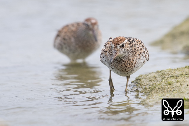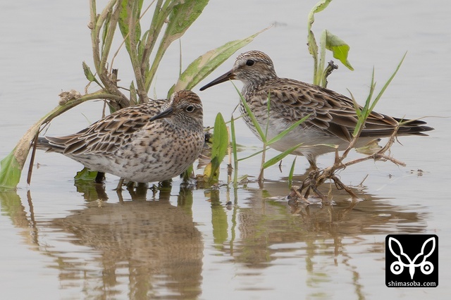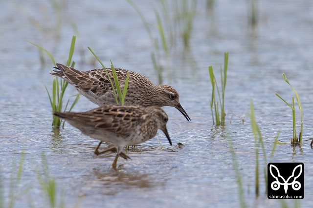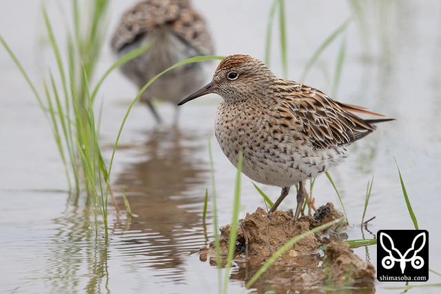 ウズラシギ 成鳥。冬羽へ換羽しつつあります。後ろはヒバリシギ。