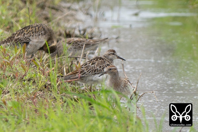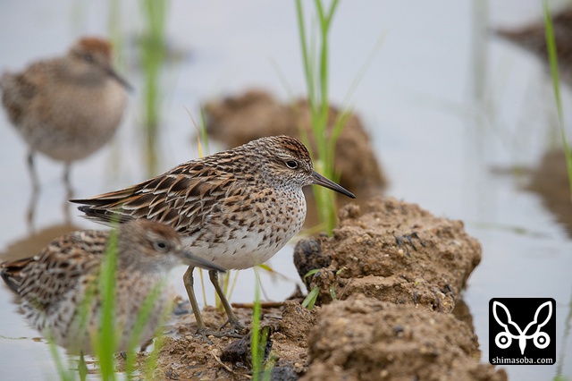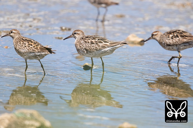 ウズラシギはみな夏羽。左2羽成鳥、右は第1回夏羽。