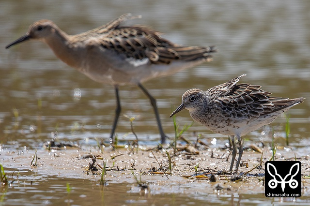 ウズラシギの幼鳥(左)と成鳥夏羽後期。