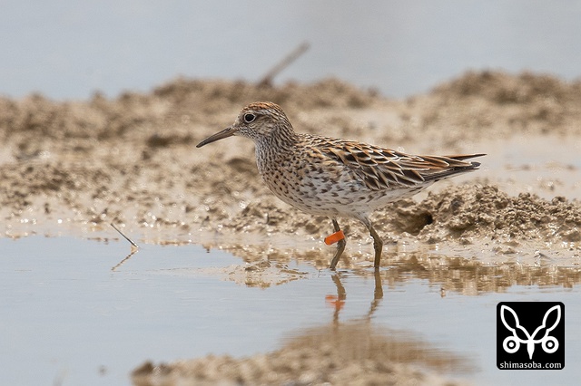フラッグ付きのウズラシギ 。オーストラリアから7000キロの長旅を経て石垣島で一休み。