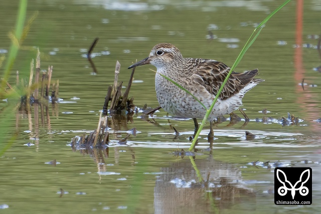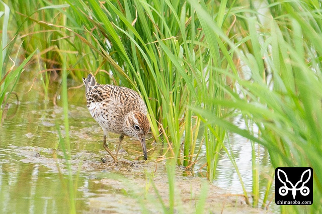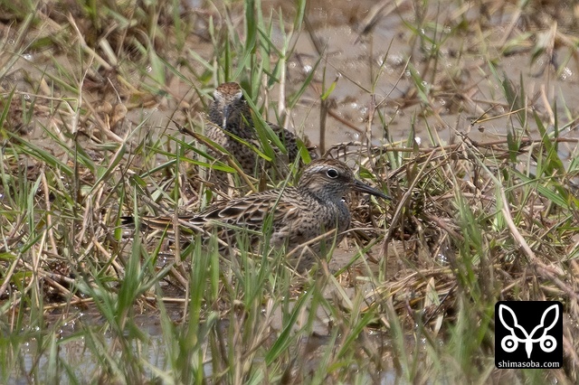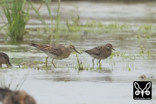 夏羽のウズラシギ。数羽の群れが数カ所に飛来。