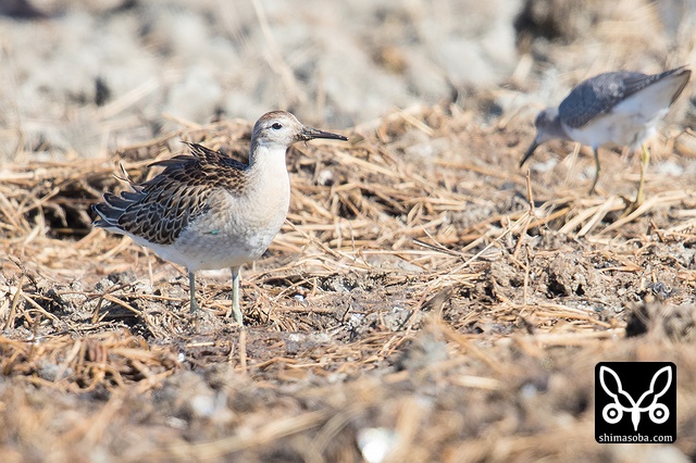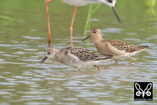 エリマキシギ第1回冬羽のメス(手前)と幼羽のメス。幼羽以外は飛来が少ないので嬉しいですね。