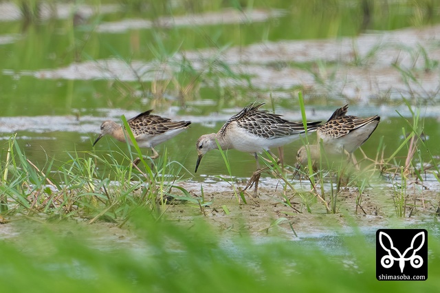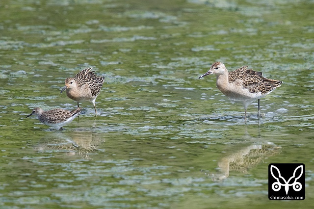 エリマキシギ幼鳥3羽。右から順にメス、オス、オス。真ん中の個体はずいぶん白っぽいですね。