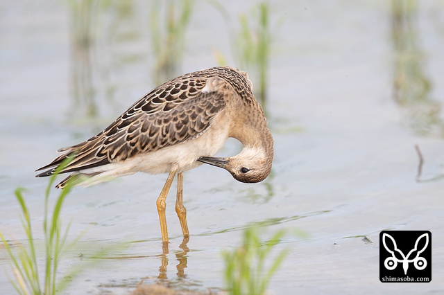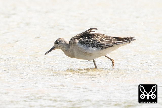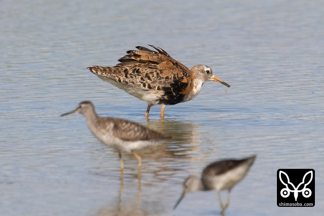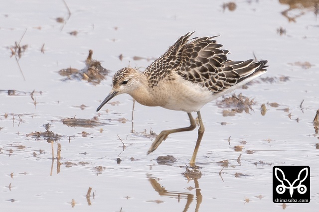 こちらもエリマキシギ幼鳥のメス。数枚だけ冬羽が出ています。