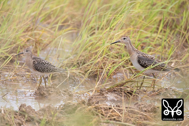 エリマキシギの幼鳥オス(右)と幼鳥メス。
