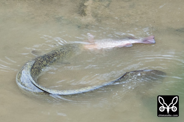 ナンヨウショウビンを見ていたらオオウナギがティラピアらしき魚を食っていました。