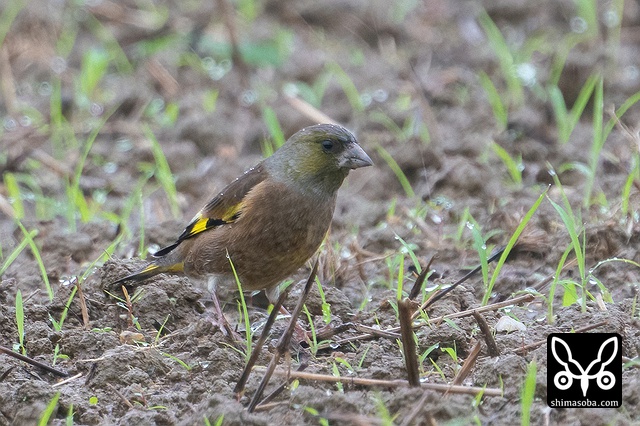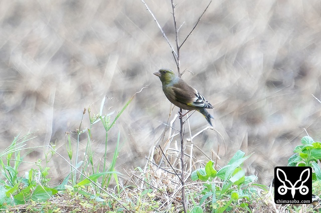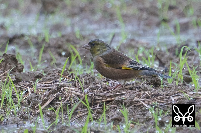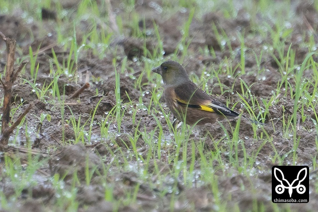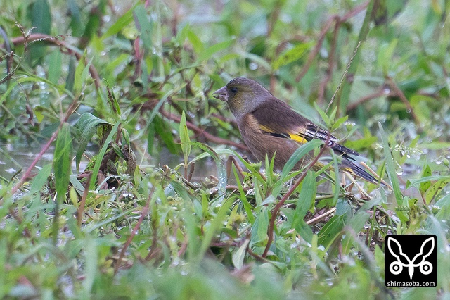 オオカワラヒワは雨に濡れながら草の種を拾っているようでした。