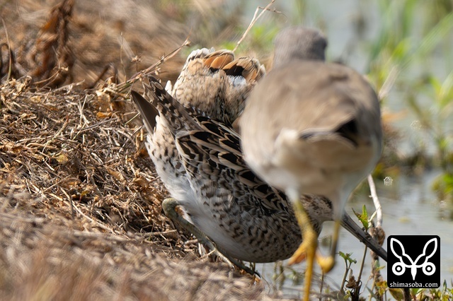 ケリに威嚇して尾羽を逆立てるオオジシギ。