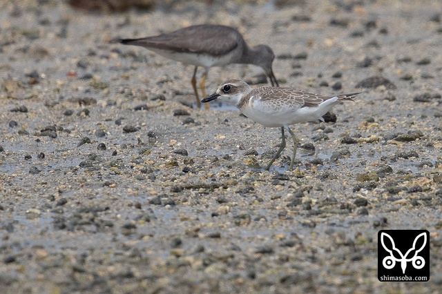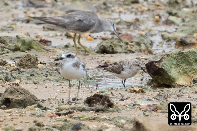 オオメダイチドリ第1回冬羽(手前)とシロチドリ。