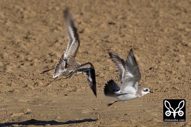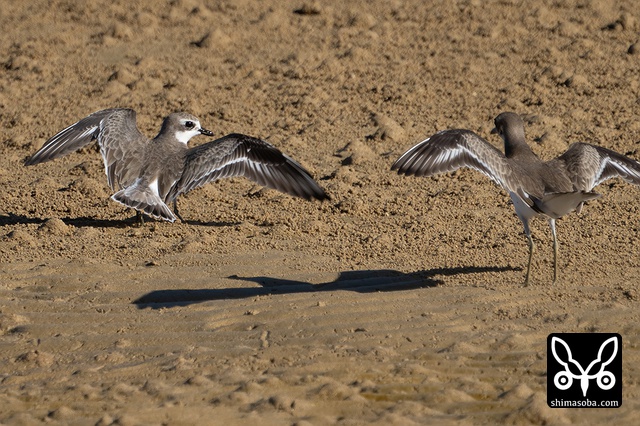 オオメダイチドリ幼鳥。チョウゲンボウが現れて逃げの体勢に入っています。