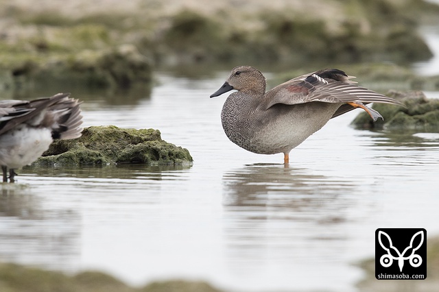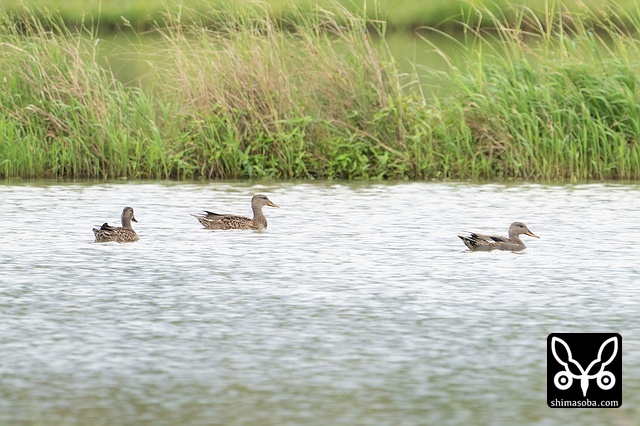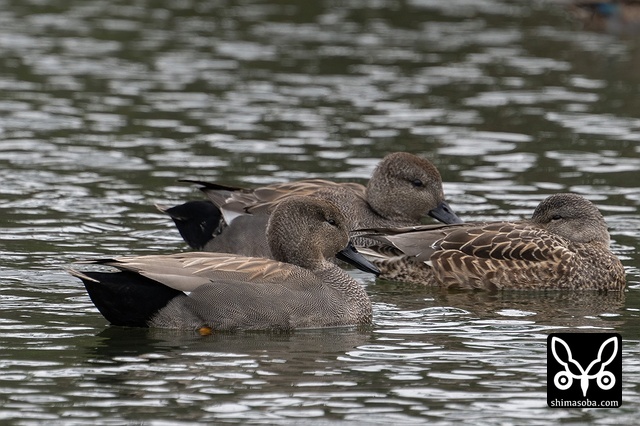 左からヒドリガモ、コガモ、オカヨシガモ。オカヨシガモは右の翼が下がっているけど、怪我でもしているのか?