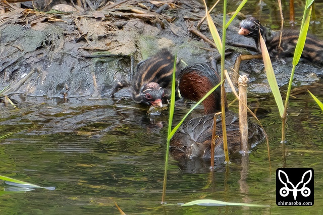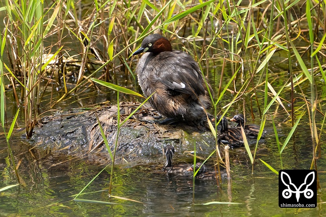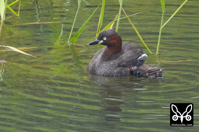 メス親の背中に乗ろうとするカイツブリのヒナ。