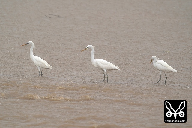 大雨の中、河口で狩りをする3羽のカラシラサギ。