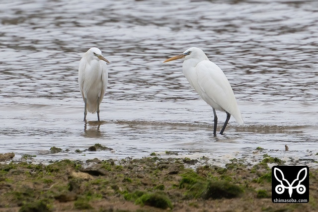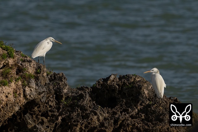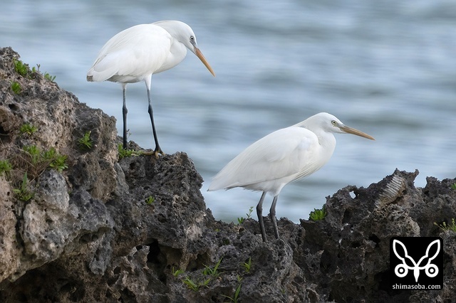 カラシラサギ2羽。満潮に追いやられて岩の上で仲良くしていました。