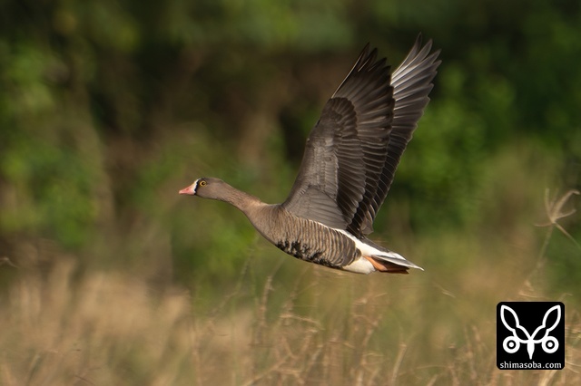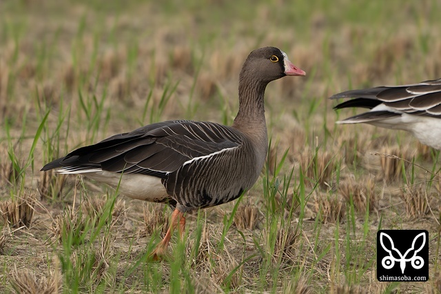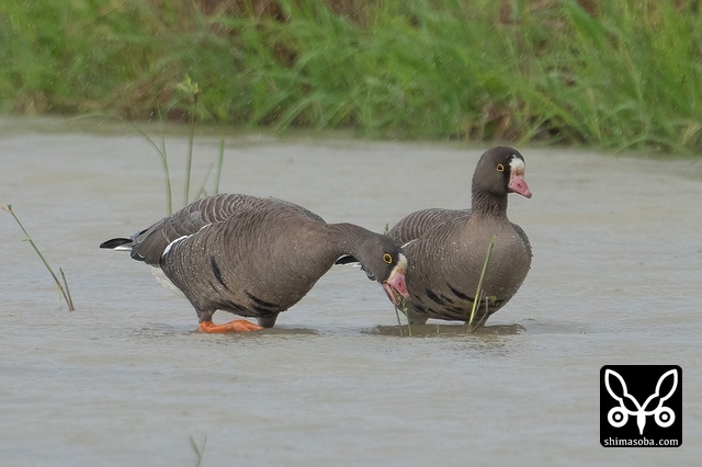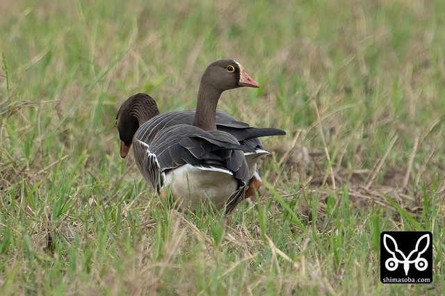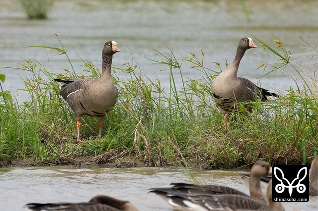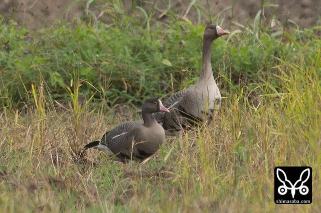 カリガネ2羽はヒシクイ、マガンの群れとは少し距離を置いて行動していました。