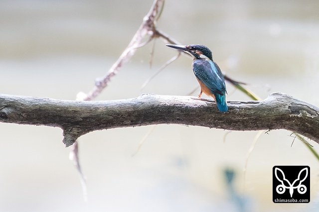 カワセミのオス成鳥。水路に突き出た枯れ枝に止まっていた。