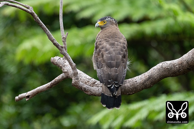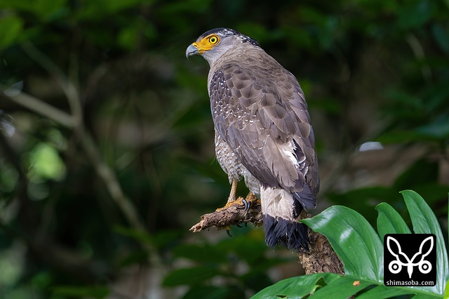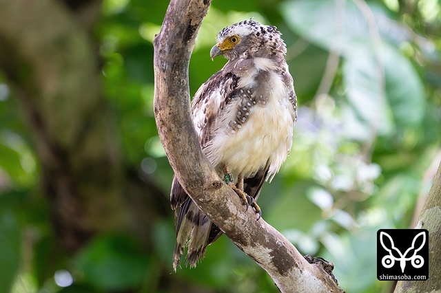 バナナに止まるカンムリワシの幼鳥。美しいです。