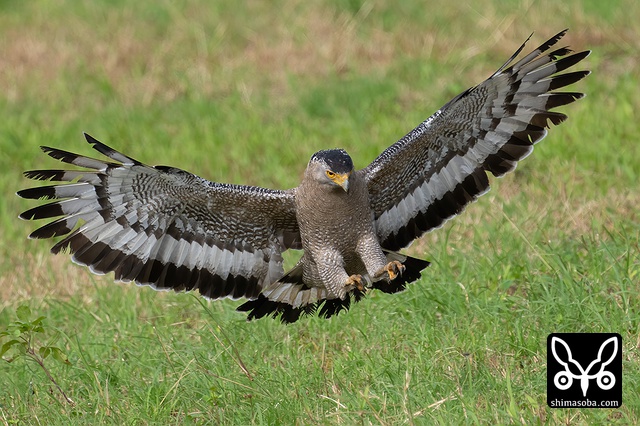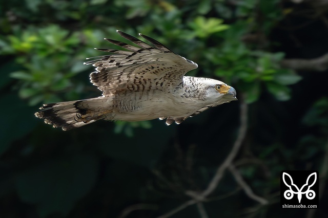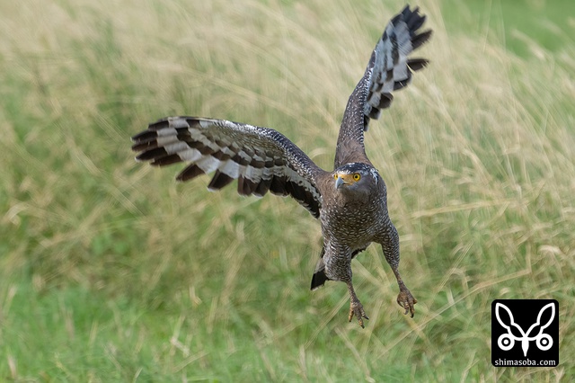 獲物を目掛けて低空を飛ぶカンムリワシ。