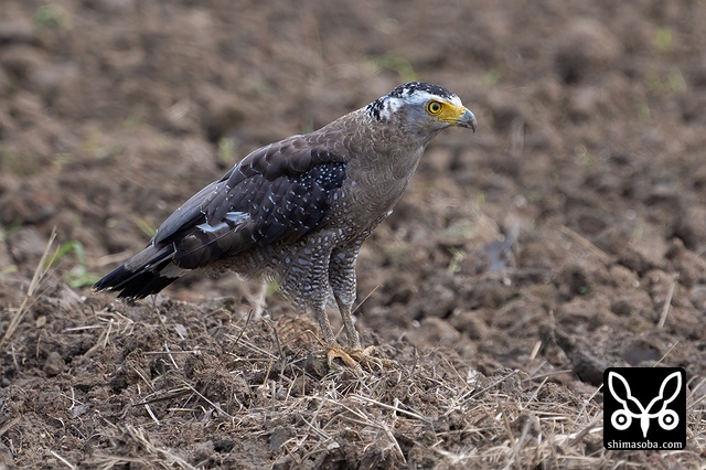 カンムリワシ成鳥。農作業中の田んぼで獲物を狙っていた。