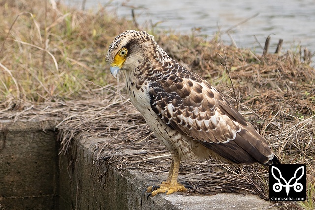 水路の脇に止まり、獲物を探すカンムリワシ。