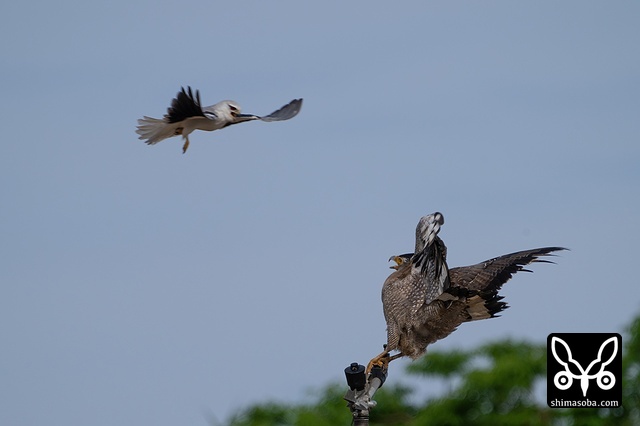 自宅のリビングからよく目撃していたカンムリワシ。いつもチョウゲンボウにちょっかいかけられています。