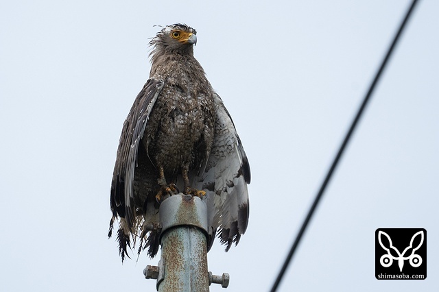 電柱で羽を乾かすカンムリワシ。記号は読めませんが、右足に緑の標識を付けているのと縄張りからして「悠々」と思われます。