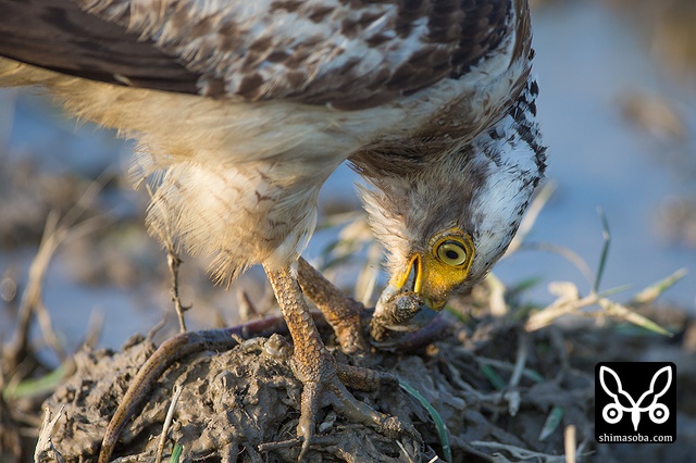 大きなオオヒキガエルを捕まえた。両目をつぶされてもしぶとく、1時間以上格闘の末、カエルをひっくり返し腹を食い破っていました。毒は食わないようですね。途中、カンムリワシの若がやってきましたが、全く相手にされずどっかいきました。動画に情けない声で鳴く若も写っています。