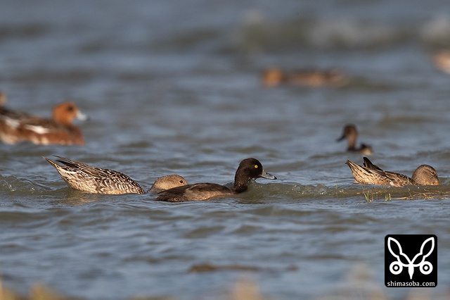 今季初確認のホシハジロ。第1回冬羽のメス。右はキンクロハジロのオス生殖羽。