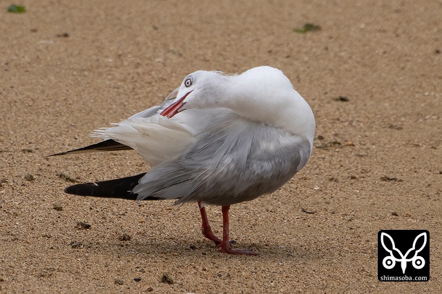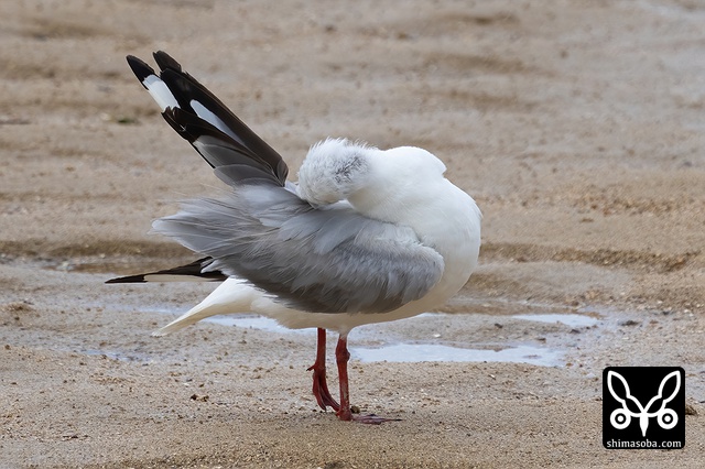 いつもの河口で水浴び後の羽繕いするギンカモメ。