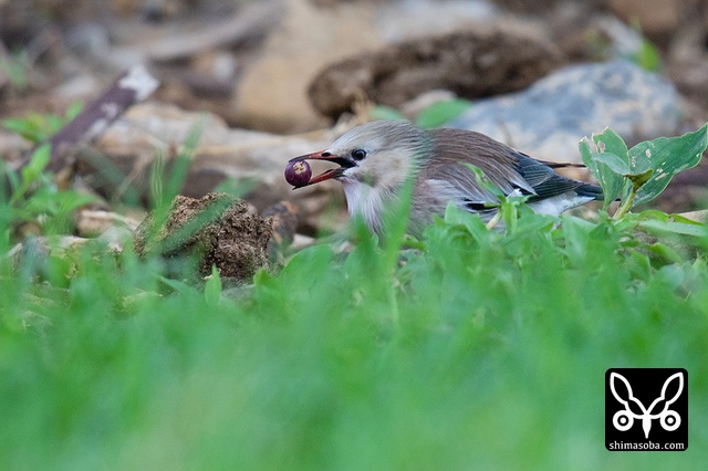 ギンムクドリのオス。落ちたオオバアコウの実を数羽の群れが食っていました。