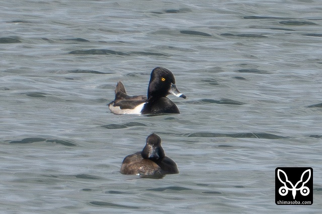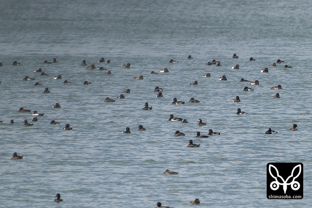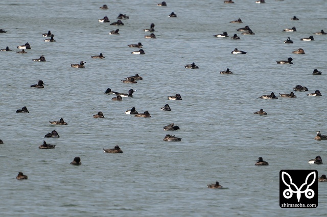 クビワキンクロのオス。北米のカモがまさか愛知県で見られるとは。ただ、鳥まで約200メートルと遠かった…。