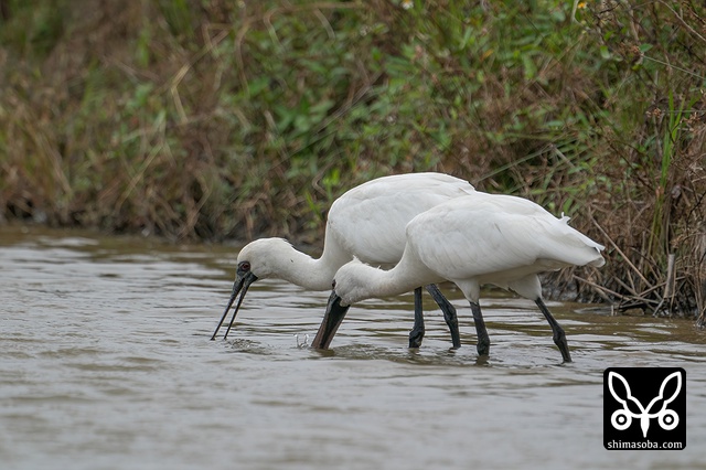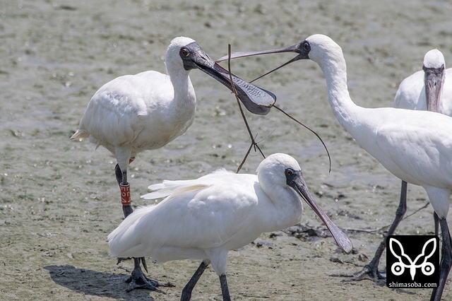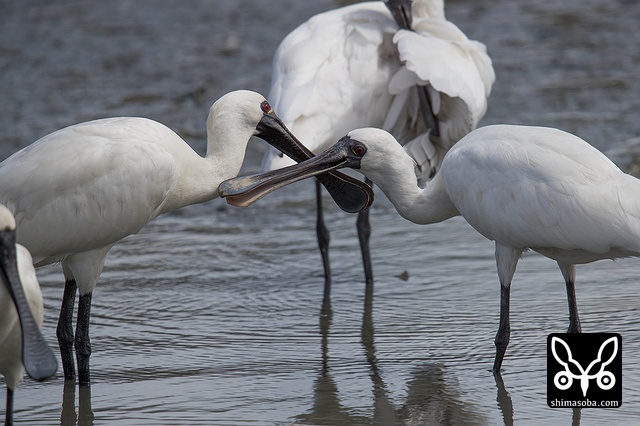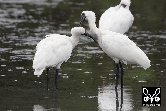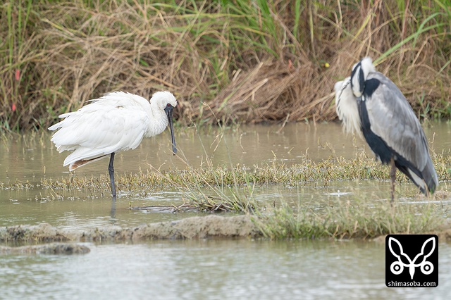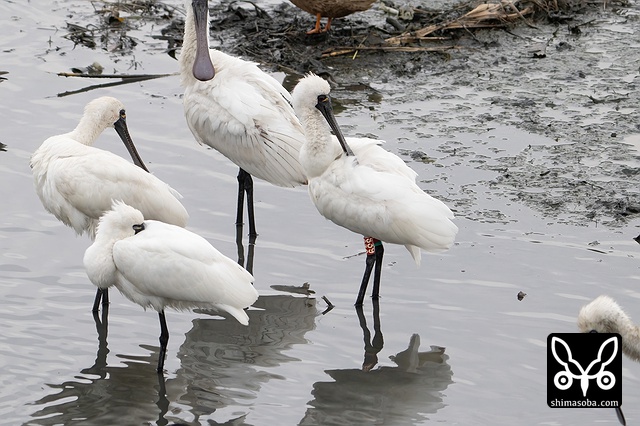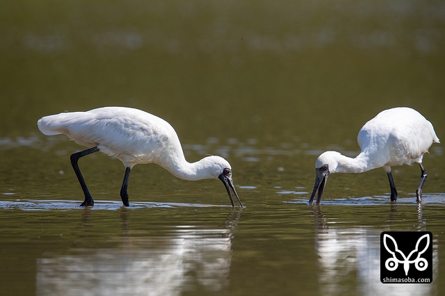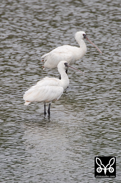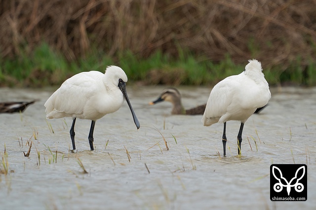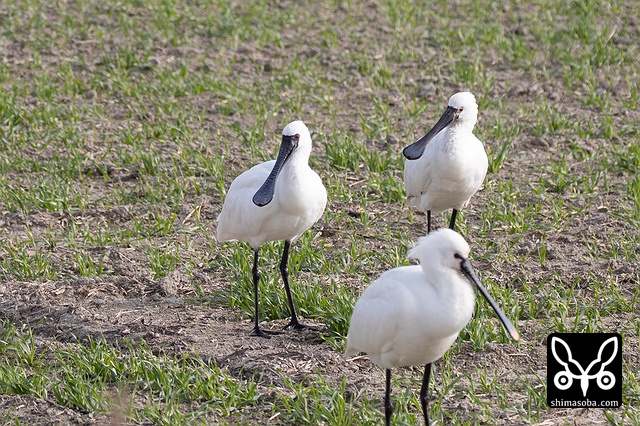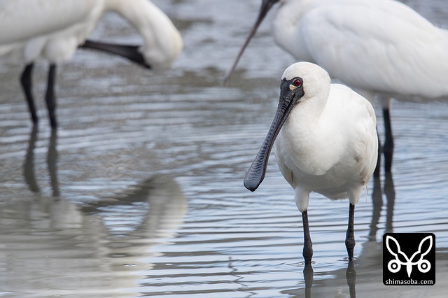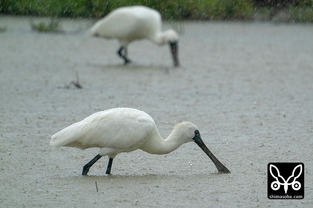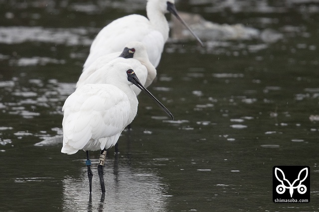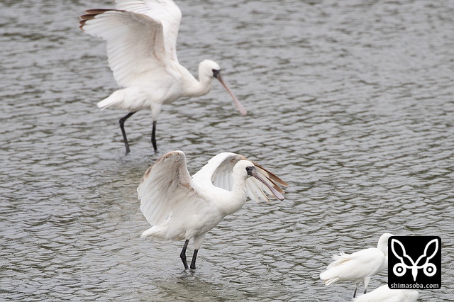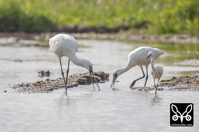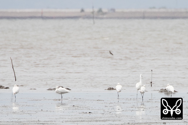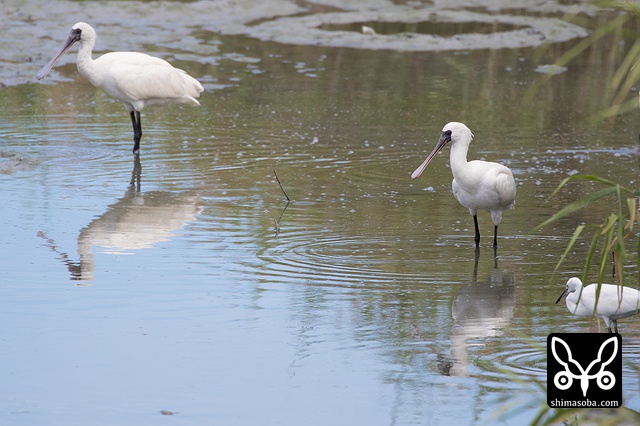 ヘラサギ(左)とクロツラヘラサギが並ぶとヘラサギの大きさが際立っています。コサギはヘラサギとクロツラヘラサギについて回っていました。2羽がくちばしを左右に振り採餌して驚いて飛び出した水生生物を捕まえようという魂胆です。