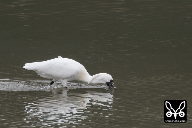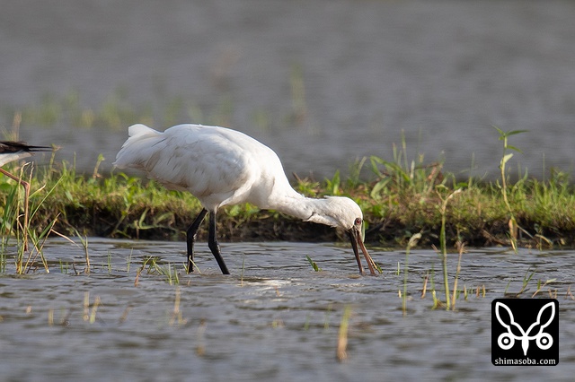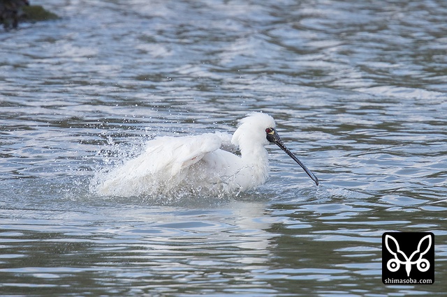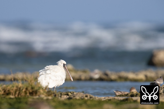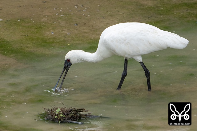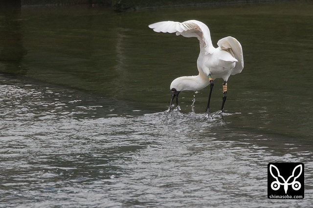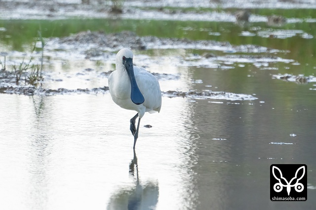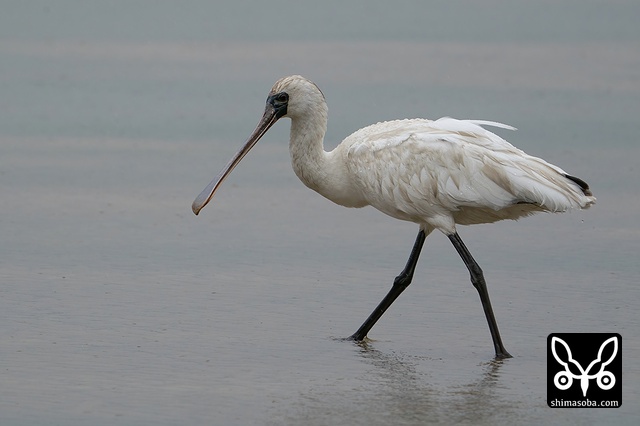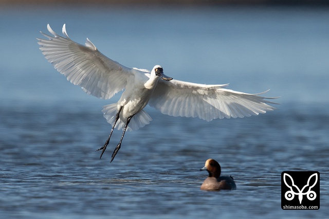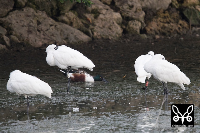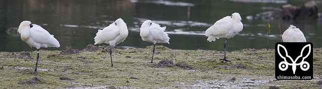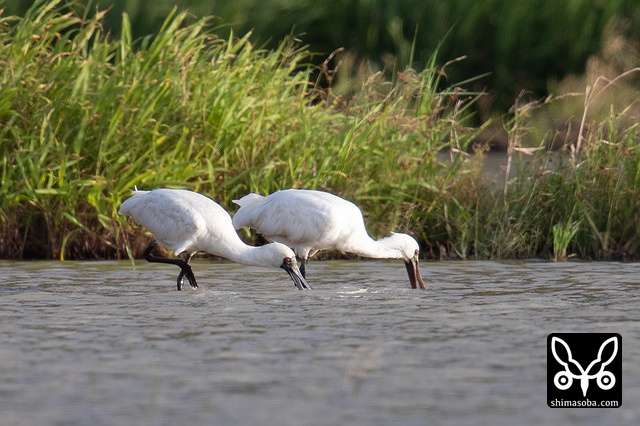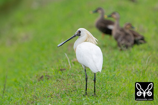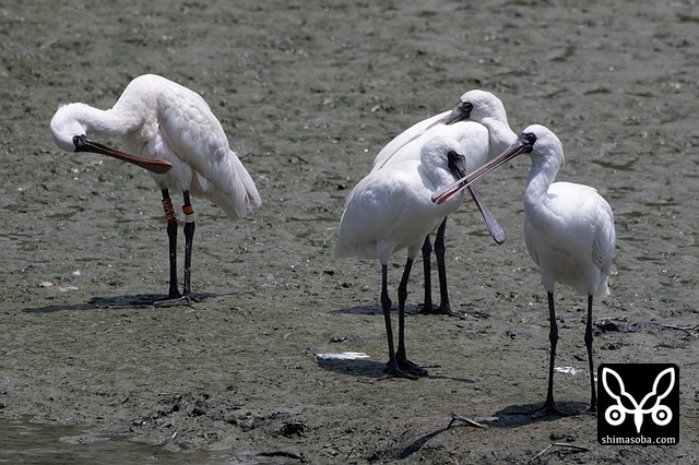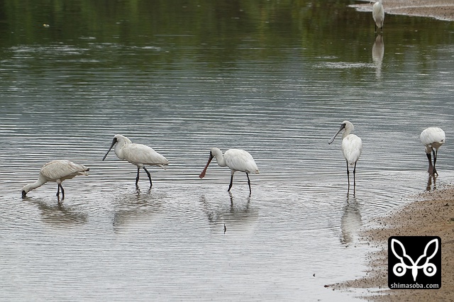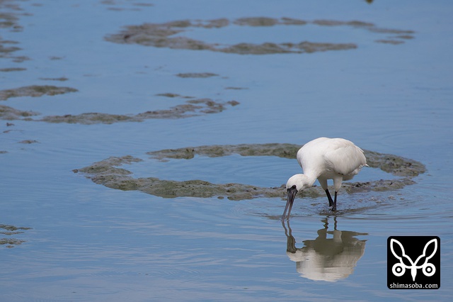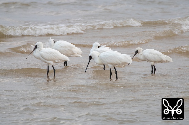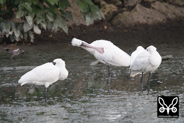 ヘラサギ(左)とクロツラヘラサギが並ぶとヘラサギの大きさが際立っています。コサギはヘラサギとクロツラヘラサギについて回っていました。2羽がくちばしを左右に振り採餌して驚いて飛び出した水生生物を捕まえようという魂胆です。