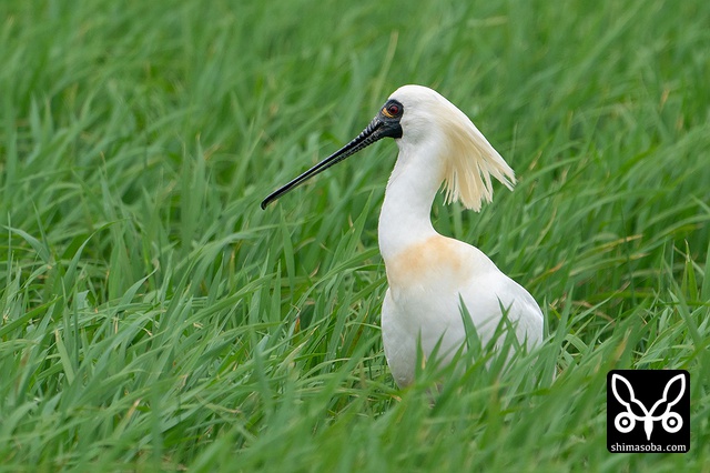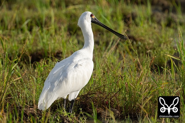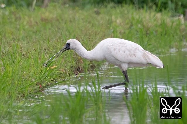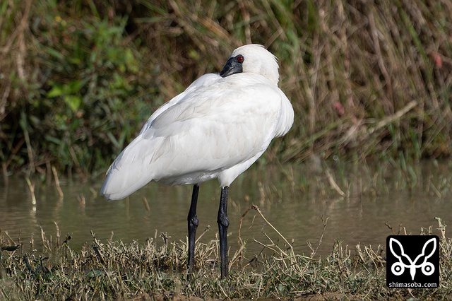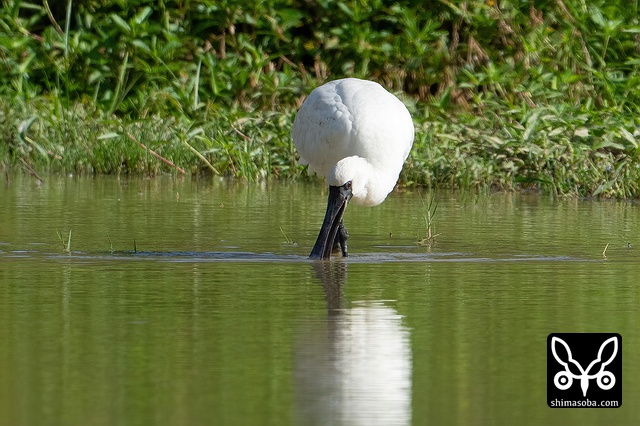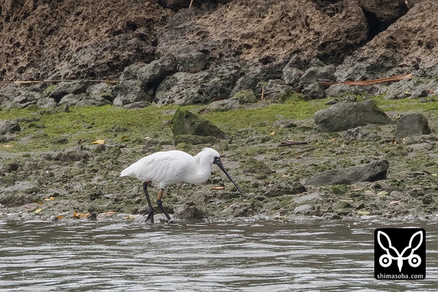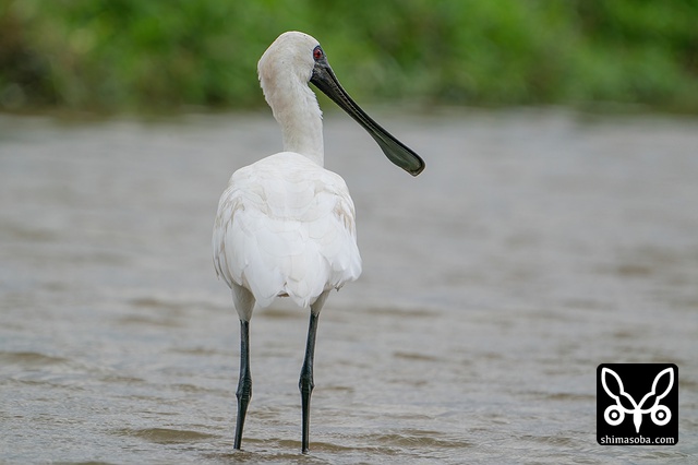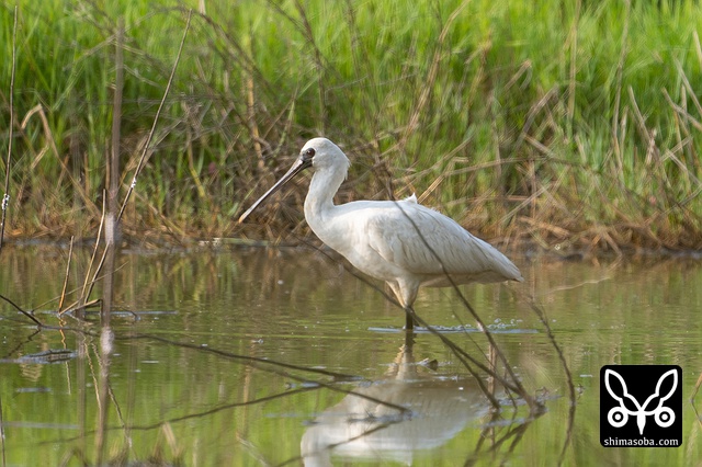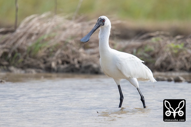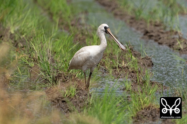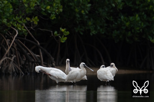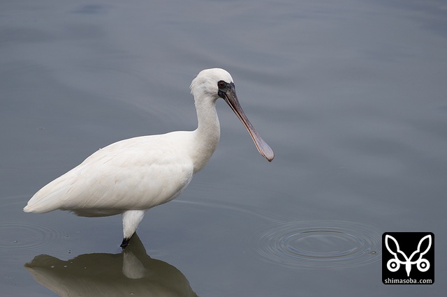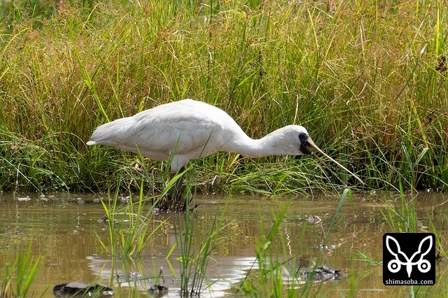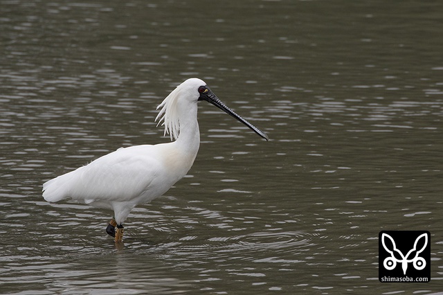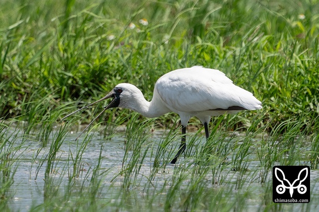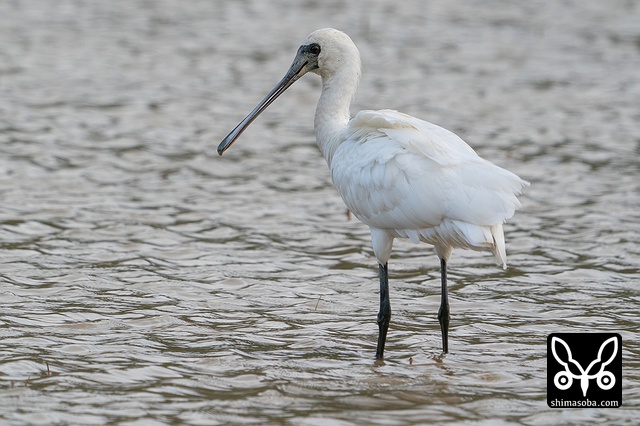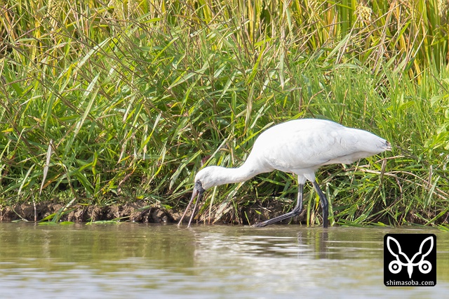 ヘラサギ(左)とクロツラヘラサギが並ぶとヘラサギの大きさが際立っています。コサギはヘラサギとクロツラヘラサギについて回っていました。2羽がくちばしを左右に振り採餌して驚いて飛び出した水生生物を捕まえようという魂胆です。