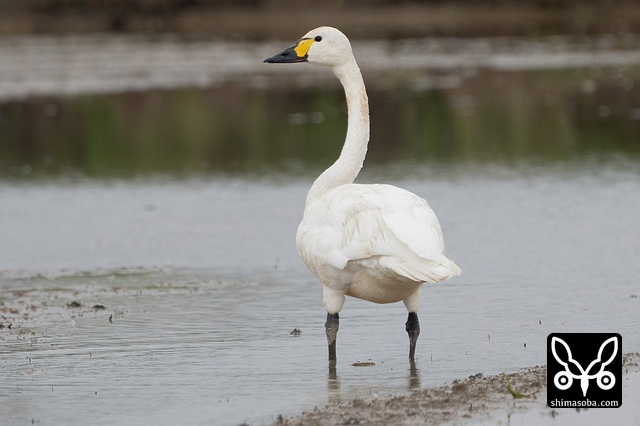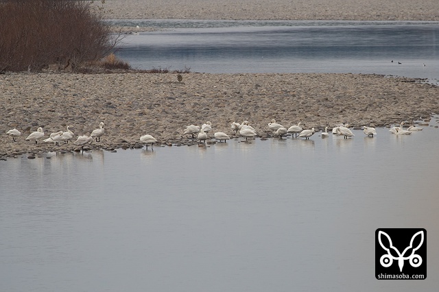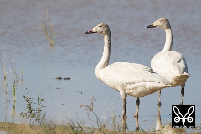 河口にコハクチョウが2羽。西表島で観察されていた個体です。
